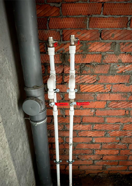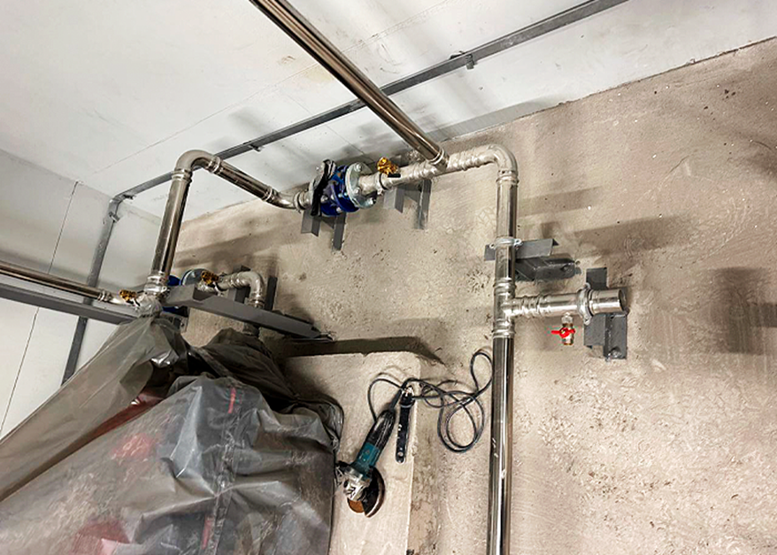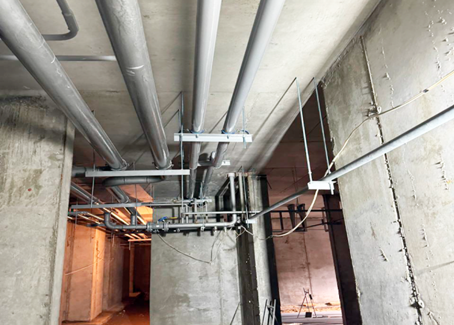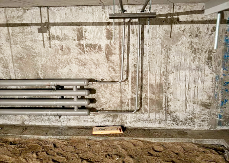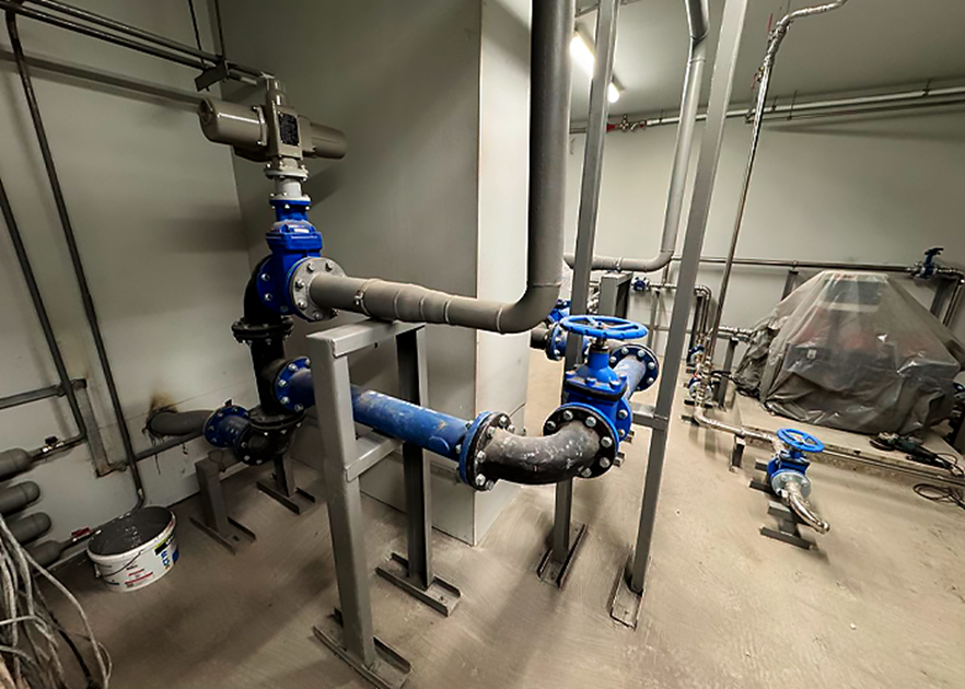 - Системы водоснабжения и канализации: Параллельно выполняется монтаж стояков и разводки холодного (ХВС) и горячего водоснабжения (ГВС), а также системы канализации. Одновременно ведется сборка и монтаж водомерного узла с интегрированной пожарной системой для обеспечения полной безопасности здания.